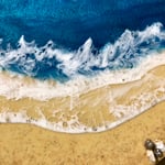 14" x 14" Ocean/beach wall art on board, with brass hanger on reverse.